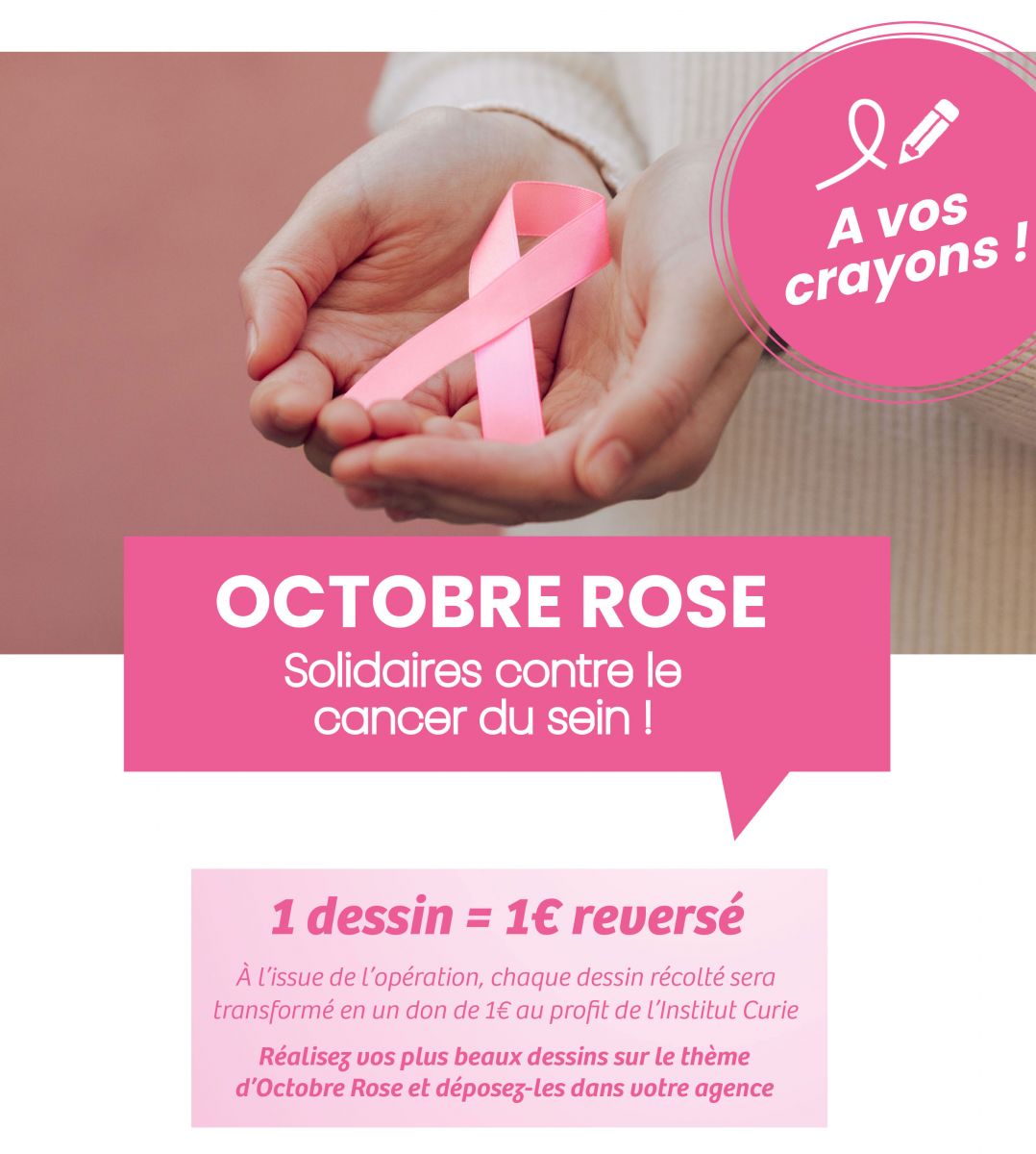 Cette année, réalisez vos plus beaux dessins, accompagnés d'un message positif pour les femmes touchées par le cancer du sein, et déposez-les dans votre agence de proximité. Les meilleurs dessins seront relayés sur notre site internet et notre page Facebook, et feront l'objet d'un livre intitulé « Octobre Rose en dessin, nos mutuelles s’engagent ! ».